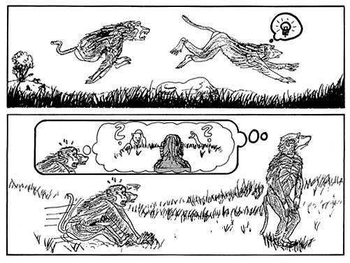 In diesem Fall sind wir auf Vermutungen angewiesen. Wahrscheinlich hat Melton diesen Dreh entdeckt, als er früher einmal auf der Flucht tatsächlich einen Feind erblickte. Nun wandte er diese Täuschung öfter an. Im Gegensatz zu Pauls Trick klappte seine Methode immer. Möglicherweise hatten ihn seine Hordenkumpane auch durchschaut. Aber das Risiko, daß vielleicht doch ein Löwe im Gras lauern könnte, war ihnen einfach zu groß, um die Verfolgung fortzusetzen.