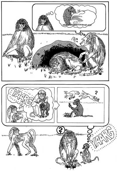 In einer anderen Pavianhorde hieß der listenreiche Irreführer Melton. Er war ein starker Jüngling. Einmal hatte er ein Affenbaby geschlagen, ein Vergehen, das stets mit Massenkeile bestraft wird. Melton floh in die Steppe hinaus. Die Horde sauste zorngrunzend hinter ihm her. Da kam ihm eine Idee. Aus vollem Lauf sprang Melton hoch auf die Hinterbeine zum Stand und schaute in die Ferne, so, als ob er dort einen lauernden Löwen oder eine Giftschlange entdeckt hätte. Die Verfolger kamen beim Bremsen ins Schleudern, starrten dann in die gleiche Richtung, sahen aber nichts. Doch der Schreck saß allen in den Knochen und ließ sie die Strafaktion augenblicklich vergessen.