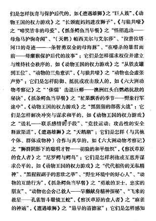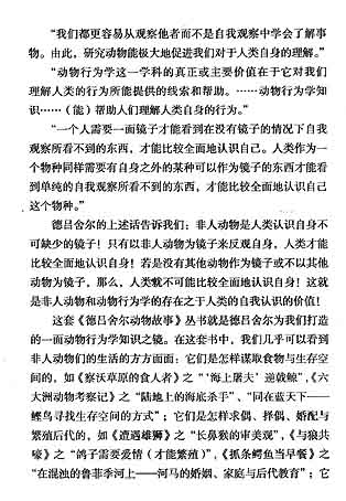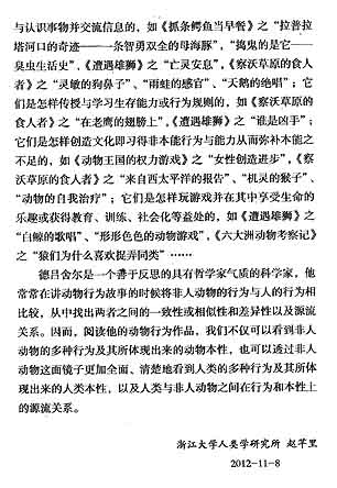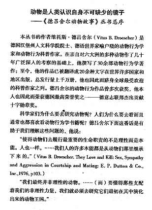 Mit diesen Worten sagt uns Dröscher, dass die Tiere für die die Menschheit ein unentbehrlicher Spiegel zur Selbsterkenntnis sind ! Nur durch nicht-menschliche Tiere als Spiegel kann die Menschheit zu einem umfassenderen Verständnis über sich selbst gelangen ! Wenn es keine Tiere gibt, die als Spiegel dienen oder wie ein Spiegel benutzt werden , ist der Mensch nicht in der Lage sich darin zu erkennen! Gerade darin liegt der Wert der Tiere und der Verhaltenslehre über Tiere für die menschliche Selbsterkennung ! Die "Tiergeschichten"- Serie von Dröscher vermittelt uns wie ein Spiegel Wissen über das Verhalten von Tieren. In dieser Buchreihe werden fast alle Aspekte des Tierlebens beleuchtet. Wir erfahren wie die Tiere Nahrung und Lebensraum erlangen z.B. in"Schwertwale - Schlächter der Meere" aus "Menschenfresser vonTsavo","Land- Killer im Meeresgrund" aus "Meine Expepitionen auf sechs Kontinenten" und "Unter dem gleichen Himmel - wie Tölpel ihren Lebensraum finden"; ebenfalls erfahren wir wie sie ihre Partner aussuchen, sich um sie werben, sich paaren und fortpflanzen in "Schönheitsideal der Nasenaffen" aus "Begegnung mit Löwen","Tauben brauchen Liebe" aus "Mit den Wölfen heulen", "Die Ehe, Familie und Nachwuchserziehung der Flusspferde im trüben Fluss Rufiji aus "Ein Krokodil zum Frühstück" Dröscher ist ein Wissenschaftler, der reflektiert und die Aura eines Philosophen besitzt. Er erzähhlt oft über das TZierverhalten und vergleicht es dabei mit dem menschlichen Verhalten. Er versucht, zwischen den beiden Aähnlichkeiten und Beziehungen zueinander herauszufinden. Durch die Lektüre seiner Werke über das Verhalten lernen wir nicht nur tierisches Verhalten verschiedener Art und die darin wiedergespiegelte tierische Natur kennen. Wir lernen durch den Spiegel der Tiere auch, verschiedene menschliches Verhalten,die menschliche Natur und sclie?lich die Beziehung zwischen Menschen und Tieren in ihrem Verhalten und ihrer Natur umfassender und klarer zu sehen. Zhao Qian li Institut für Antrhropologie der Universität Zhejiang "...Vielleicht können wir durch dieses Buch den Weg aus dem Paradies zurückverfolgen und etwas Frieden und Ruhe in unser Denken und Leben bringen". Dies ist ein klarer Hinweis auf den grunglegenden Zweck seinesSchaffens, nämlich die Hoffnung, die harmonische Beziehung von Natur und Mensch zu fördern und schließlich eine bessere Welt zu erreichen, in der alle Arten in friedvollem Miteinander leben.